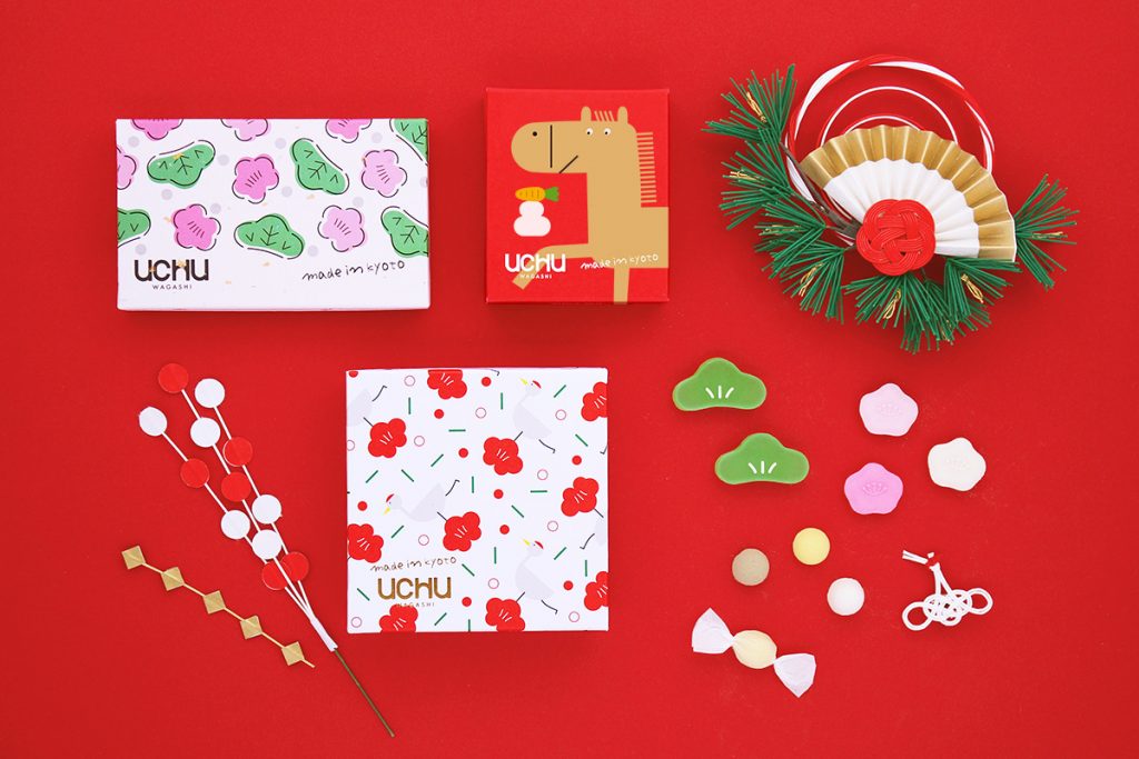 お正月らしさ満載、お正月の落雁。3色の梅の落雁と琥珀糖の松がセットに。お正月を華やかに彩る新商品です。